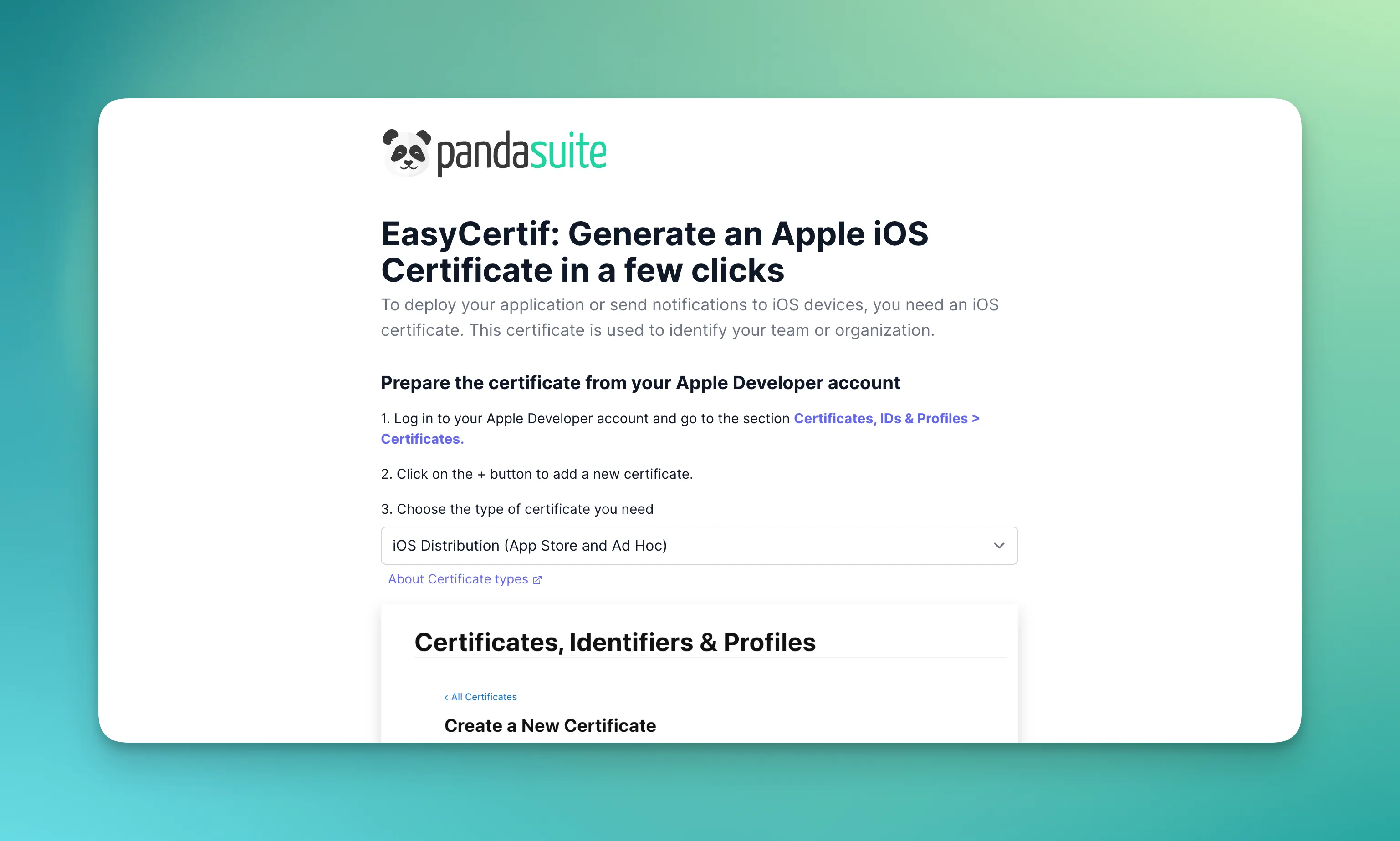 When exporting an iOS app, the binary file (IPA) must be signed with an iOS certificate. This process usually requires owning a Mac or using command line on Windows to generate a certificate signing request (CSR). To simplify these steps, the PandaSuite team has developed the EasyCertif tool, which allows PandaSuite users to easily generate an iOS certificate online with just a few clicks.
