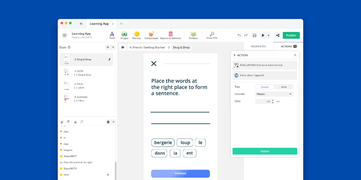 Côté création, découvrez le nouveau composant Editeur de texte enrichi pour prendre des notes et une nouvelle action Déclencher un retour haptique (vibration).