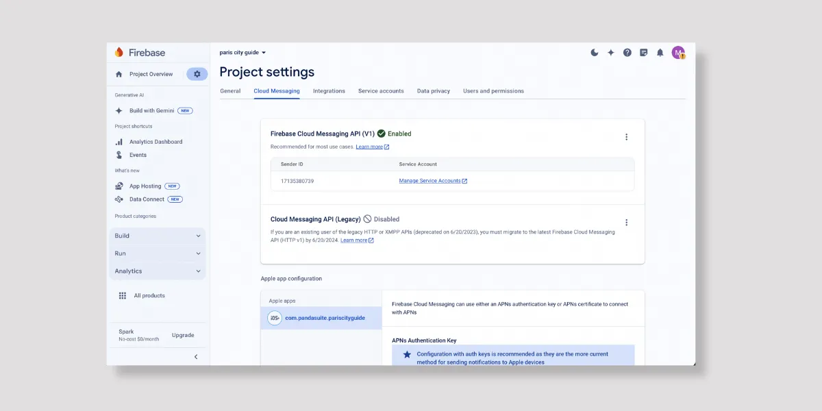 Depuis juin 2024, Firebase a changé ses paramètres de configuration. Bonne nouvelle : PandaSuite prend en charge ce nouveau protocole FCM et n’hésitez pas à suivre notre tutoriel pour migrer vers la nouvelle API FCM HTTP v1.