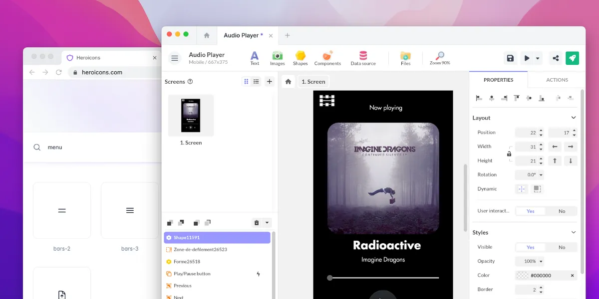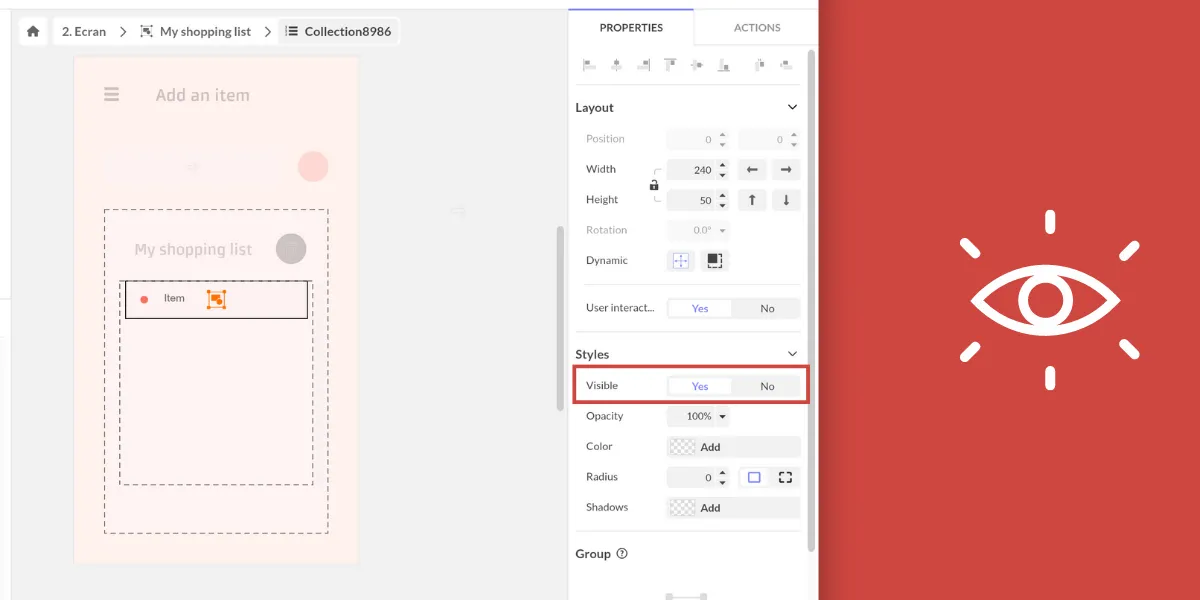 La nouvelle propriété Visibilité permet d’afficher ou non un objet de votre interface. Elle est de type booléen : Oui ou Non. À la différence de l’opacité, lorsqu’un objet n’est pas visible, celui-ci n’existe plus et n’est pas “rendu” sur les différentes plateformes. C’est donc une propriété particulièrement utile pour l’affichage dynamique d’un contenu notamment dans un composant Flexbox ou Collection, par exemple quand le contenu est vide, afin de réduire l’espace.