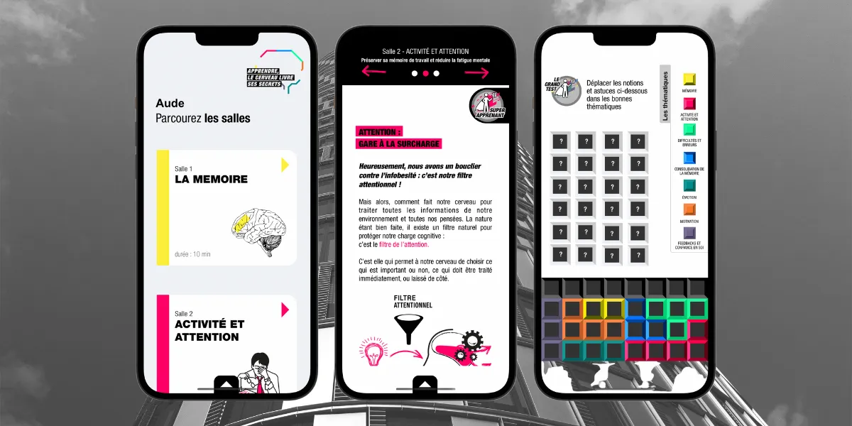 L’IFCAM est l’université du Groupe Crédit Agricole. Elle propose une exposition physique itinérante (des panneaux et bornes multimedia) sur ses Campus pour sensibiliser les salariés au fonctionnement de leur cerveau. La crise du Covid les oblige à repenser le mode d’apprentissage. Leur enjeu est comment proposer une version digitale de cette exposition pour la rendre accessible au plus grand nombre et surtout engager les apprenants sur ce format ?