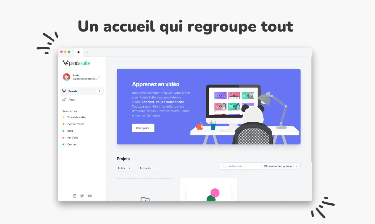 Désormais, vous avez un seul endroit qui regroupe tout : la liste de vos projets, de vos applications, les ressources pédagogiques (vidéos & tutoriels), le formulaire de remontées de bug, les moyens de contacter l’équipe. Tout est accessible depuis votre application PandaSuite Studio. Pour accéder à vos apps, c’est via un lien externe qui pointe toujours vers votre dashboard.