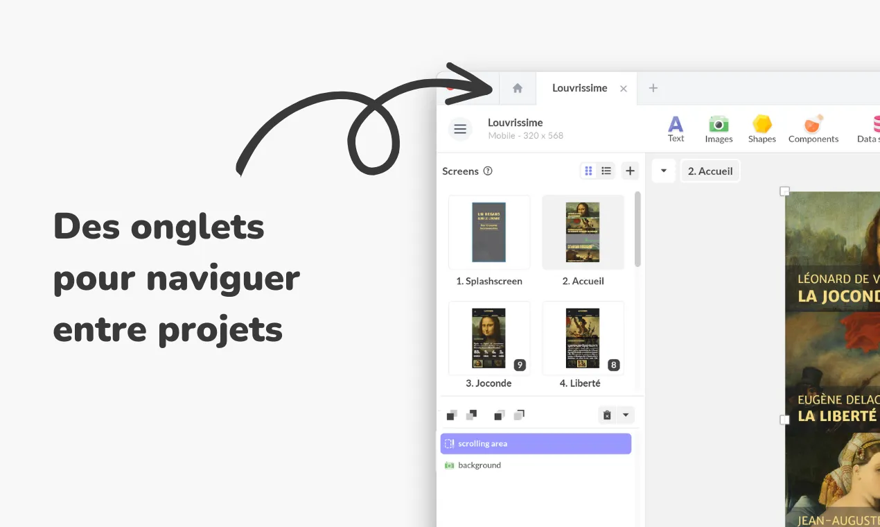 Après moultes réflexions et feedbacks, nous avons supprimé les onglets pour considérer le projet comme racine du fil d’Ariane. C’est au niveau du projet qu’on accède aux avant-plans, arrière-plans et écrans.