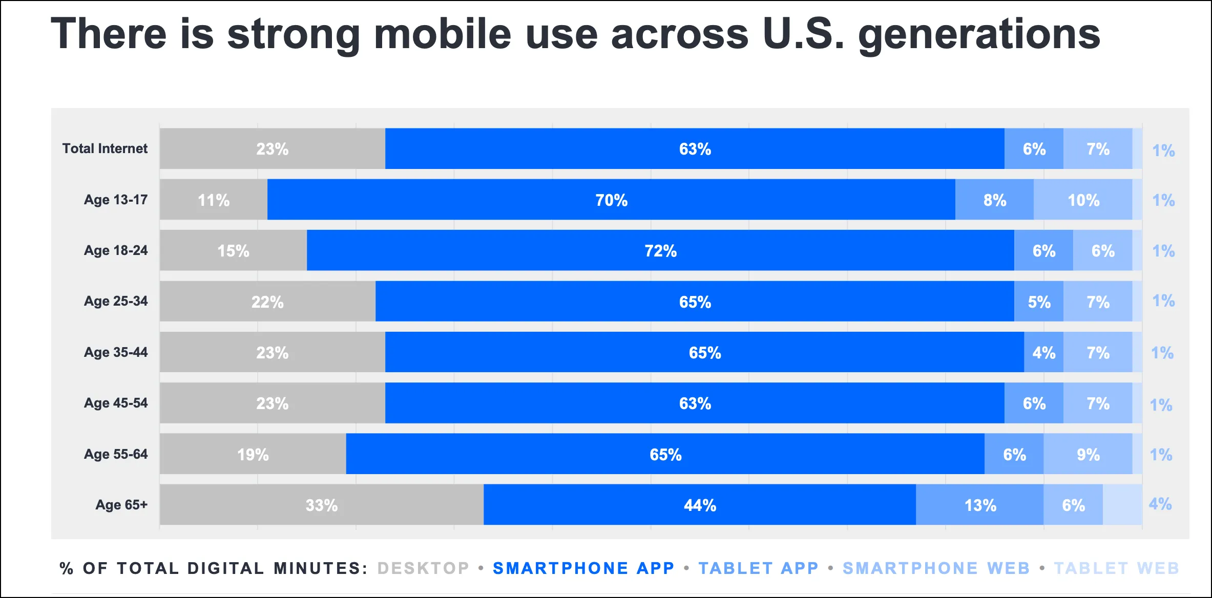 Les Américains entre 55 et 64 ans passent 65% de leur temps digital devant une app mobile (2019 Global State of Mobile – Comscore)