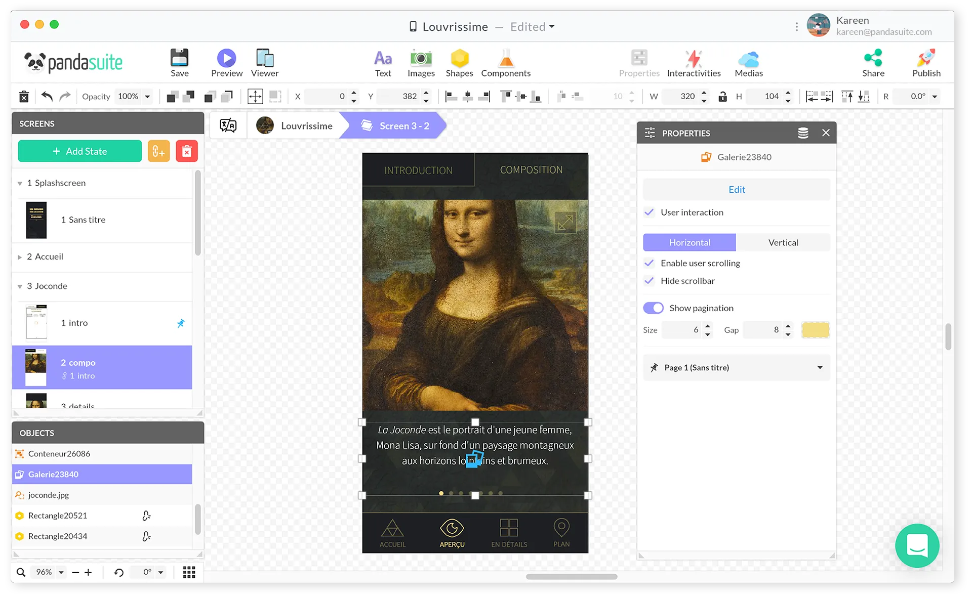 - Si vous souhaitez recréez votre menu de navigation dans le studio de création, créez vos boutons et utilisez la fonction PandaBridge.setSnapshotData pour remonter vos différentes pages. En savoir plus